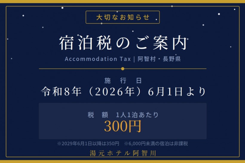 2026年6月1日より、長野県条例および阿智村条例に基づき、宿泊税を導入いたします。